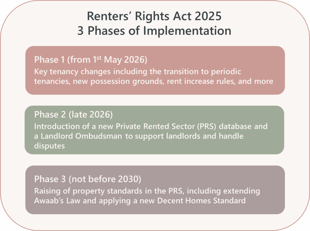 The government has announced that the Act will be implemented in three stages to help landlords, agents and tenants get ready for the changes.